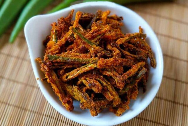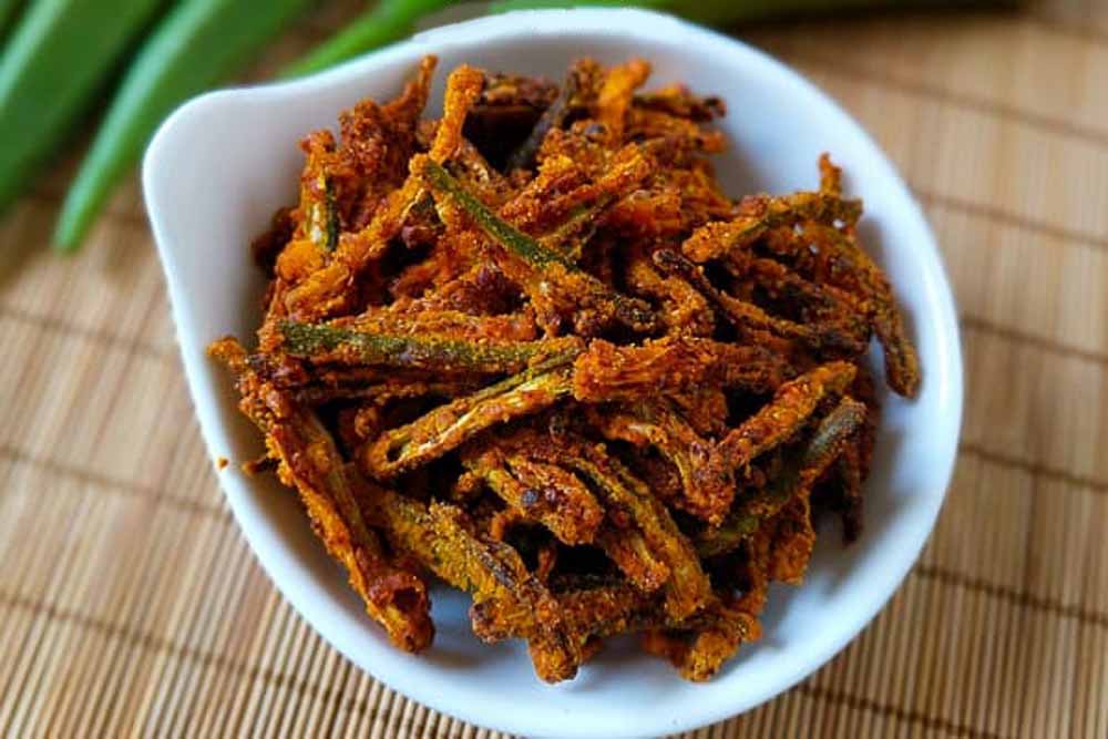 एक कड़ाही में एक बड़ा चम्मच तेल गर्म करें। इसमें कटी हुई भिंडी डालकर मध्यम आंच पर तब तक भूनें जब तक कि वह हल्की सुनहरी और कुरकुरी न हो जाए। इसे निकालकर एक अलग प्लेट में रख दें।